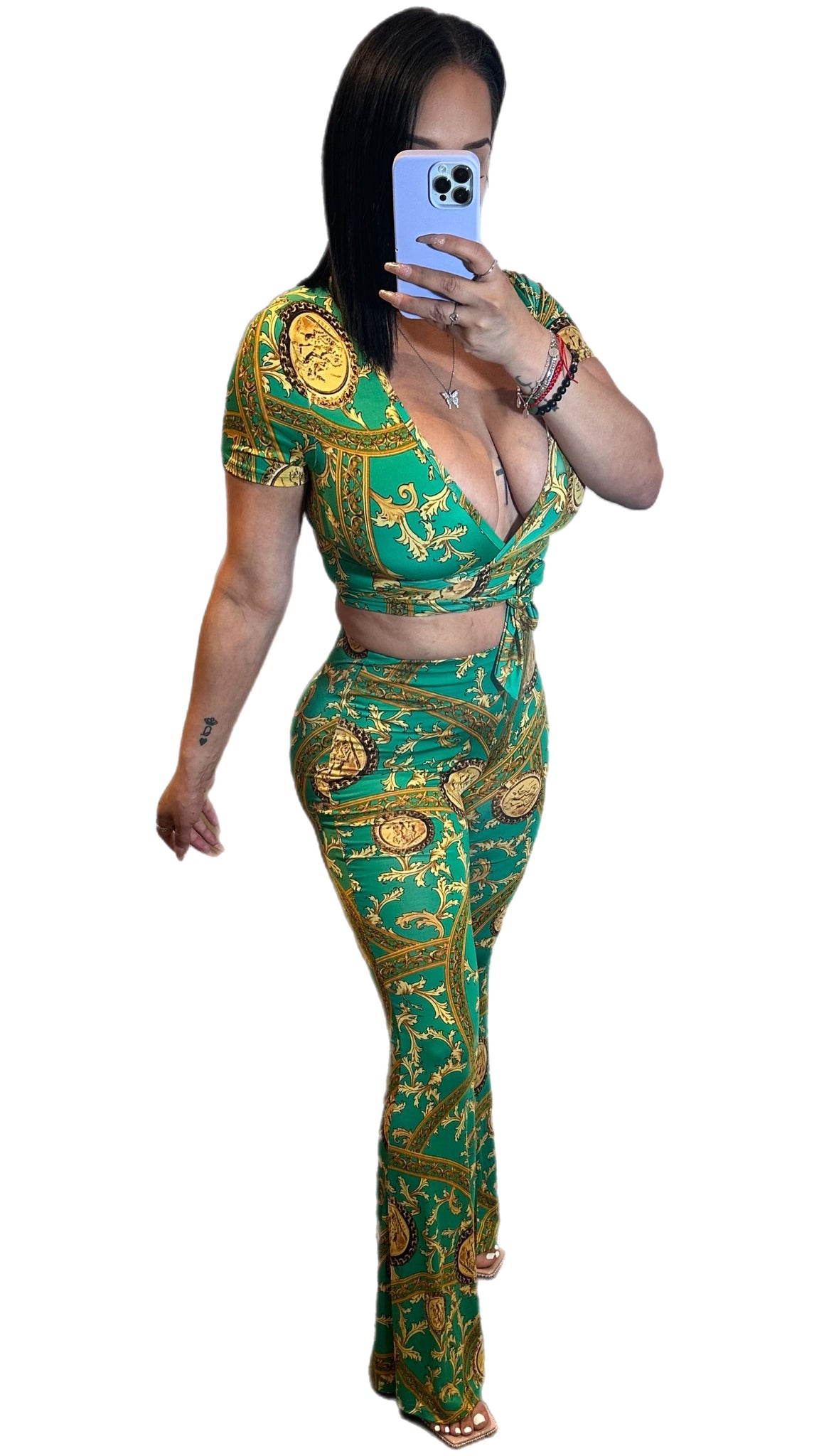 The Duo flower is a versatile and elegant two-piece set perfect for any occasion. The pieces are crafted with a beautiful green and gold design, adding a touch of luxury to your ensemble. Elevate your style and stand out with this stunning accessory